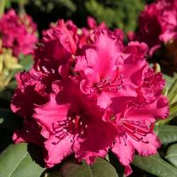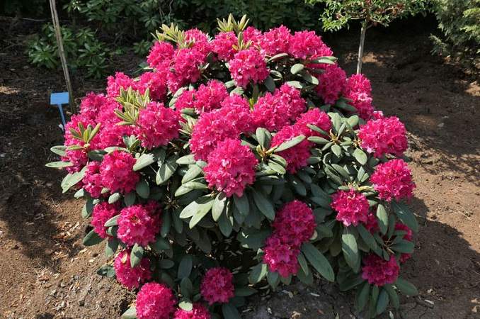 Рододендрон вечнозеленый Neon Kiss (Неон Кисс). Цветки очень крупные, неоново-малиново-розовые, с гофрированными лепестками. Листья темно-зеленые. Куст высотой до 120 см, плотный. Сорт выносливый, морозостойкий (-30 °C), цветет исключительно обильно. Цветение в конце мая — начале июня.