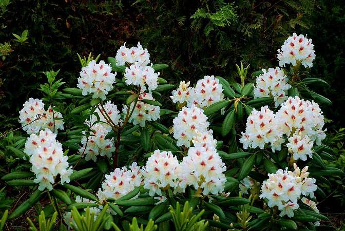 Рододендрон P.M.A. Tigerstedt (Тигерштэт). Является очень выносливым сортом, он хорошо приспосабливается к разным условиям и даже переносит, в некоторой степени, недостаток влаги. За десть лет он достигает высоты более 1,5 метров. В тени он начинает сильно разветвляться, но на светлом месте вырастает в гармонично выглядящий, широкий и высокий куст. Цветёт с конца мая. Чрезвычайно зимостойкий финский сорт (до -36ºC).
