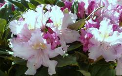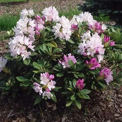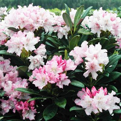Рододендрон вечнозелёный Pohjola's Daughter (Похьёлас Доте). Сорт финской селекции со светло-розовыми цветками в больших соцветиях. Крупноцветковый. Куст плотный с крупными листьями достигающий высоты 1-1,3 м в десятилетнем возрасте. Сила роста средняя. Очень высокая морозостойкость –34°C. Цветение с конца мая.