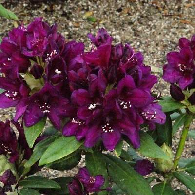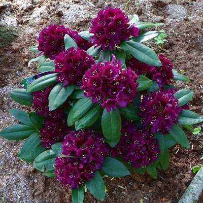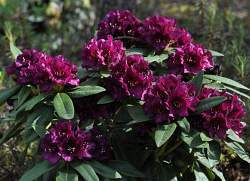 Рододендрон Polarnacht (Поларнахт). Выведен в Германии в 1976. Пожалуй, самые тёмные цветы с почти чёрными тенями в складках лепестков при общем тёмно-кардинальски-фиолетово-свекольном цвете. На их фоне очень выразительно выделяются белые пыльники. Листья крупные тёмные вечно-зелёные.