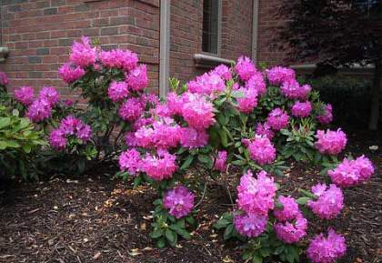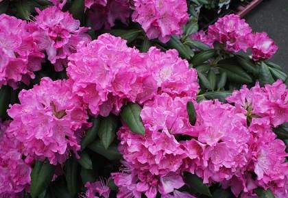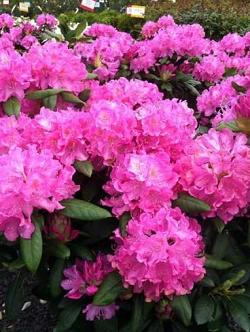 Рододендрон Roseum Elegans (Розеум Элеганс). Проверенный в северных районах сорт английской селекции. Цветки розовые с нежным красновато-коричневым пятнышком (до 7 см), широко воронковидные, по краю слегка волнистые, собраны по 15 штук в компактные соцветия.