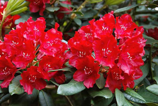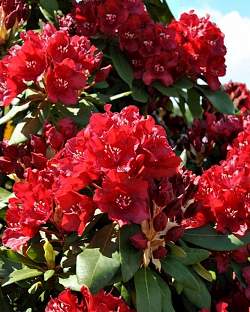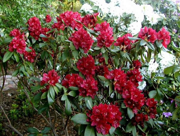 Рододендрон Sammetglut (Самметглют). Вечнозелёный кустарник с приподнятой ажурной кроной. Высота около 150 см. Цветки тёмно-красные, на их фоне изумительно смотрятся белоснежные тычинки. Листья большие, матово-зелёные, декоративные.