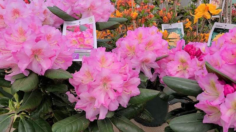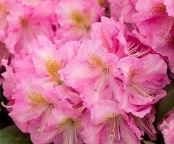 Рододендрон Scintillation (Синтиллейшн). Сорт гибридного происхождения из группы крупноцветковых. Вечнозеленый кустарник. Куст округлой формы, в возрасте 10 лет достигает 120 см высоты и 120 см ширины. Листья зеленые, с небольшим оливковым оттенком. Листовая пластинка крупная, гладкая, блестящая, длиной 15 см, широкая. Нижняя сторона листовой пластинки без опушения. ветия сферической или конической формы из 9-15 цветов. Цветение: средина мая–начало июня.