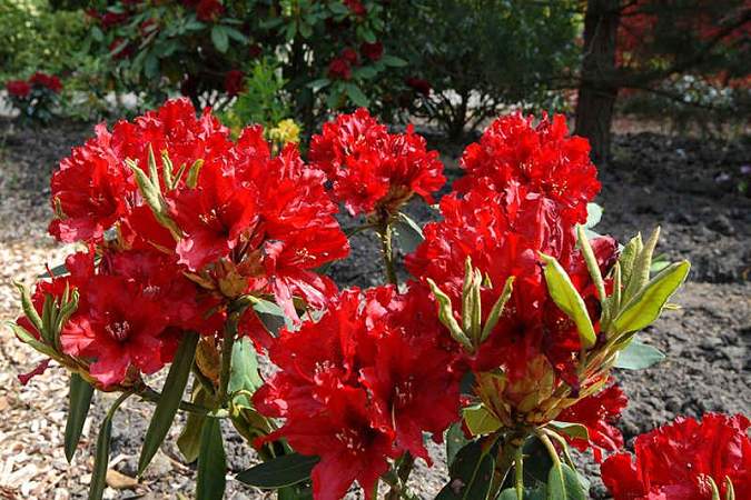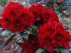 Рододендрон вечнозеленый Taragona (Тарагона). Цветки очень яркие, чисто-красные с небольшим крапом на верхнем лепестке, блестящие. Лепестки гофрированные. Белые пыльники красиво выделяются на красном фоне. Листья темно-зеленые.