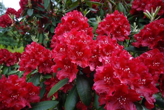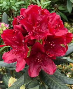 Рододендрон вечнозеленый Torero (Тореро). Превосходный новый сорт. Морозостойкий (-26°C), красивого силуэта, яркий. Цветки темно-красные, пыльники белые, красиво выделяются на насыщенном фоне. Лепестки слегка гофрированные. Важно то, что цветки совсем не выгорают на солнце.
