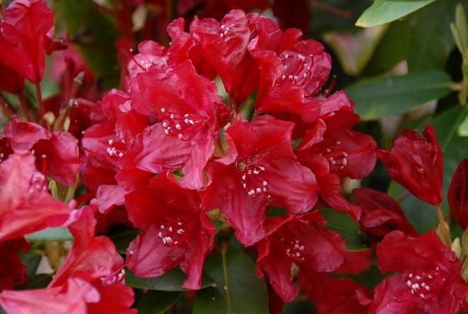 Рододендрон вечнозеленый Torero (Тореро). Превосходный новый сорт. Морозостойкий (-26°C), красивого силуэта, яркий. Цветки темно-красные, пыльники белые, красиво выделяются на насыщенном фоне. Лепестки слегка гофрированные. Важно то, что цветки совсем не выгорают на солнце.