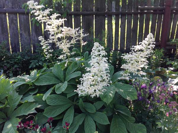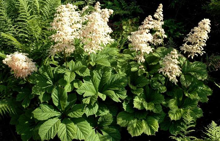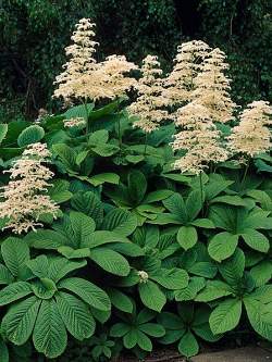 Роджерсия конскокаштанолистная. Замечательный структурный многолетник с крупными перистыми листьями и белыми метельчатыми соцветиями. Высота цветоносов доходит до 150 см, метелки очень крупные, до 30 см в высоту, пушистые, бело-кремовые. Растение выглядит привлекательно весь период вегетации, но в цвету оно просто потрясающе.