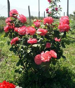 Роза Aachener Dom (Аахенер Дом). Второе, более распространенное имя этой розы — Розовая Пантера. Эту красивую чайно-гибридную розу правильнее было бы называть грандифлора, так как ее крупные цветки обычно появляются в кистях. Цветки красивого лососево-розового цвета, слегка более оранжевого в начале и более розового в конце цветения, но оттенок всегда очень красивый.