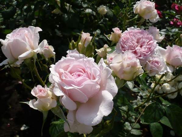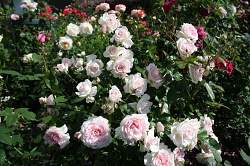 Роза Alexandra Princesse de Luxembourg (Алексадра Принцесс де Люксембург). Нежно-розовые цветки с более ярким центром, крупные, старинной формы, с умеренным сладким ароматом, в небольших соцветиях на средне-рослом, вертикальном кусте со средне-зеленой, глянцевой, плотной листвой.