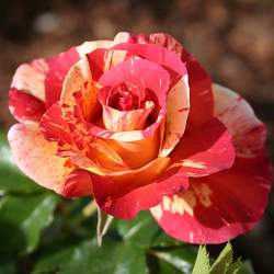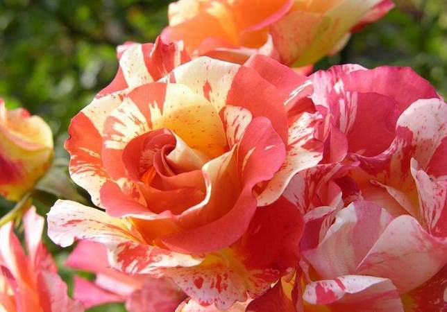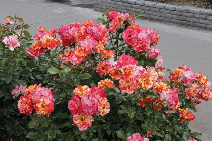 Роза Alfred Sisley (Альфред Сислей). Эта роза с розовыми и оранжевыми мазками на желтом фоне посвящена известному импрессионисту. Цветение очень обильное. Сорт достаточно устойчив к заболеваниям. Легкий аромат персиков, яблок и ананаса. Высота – 80 см, цветки крупные, в больших кистях.
