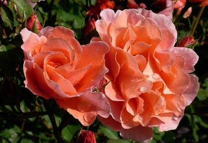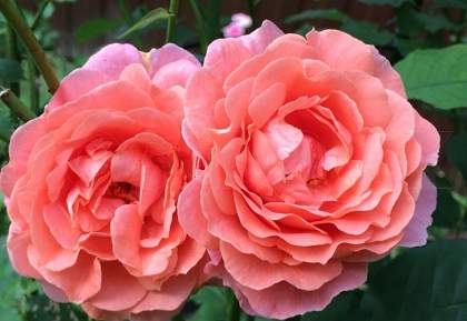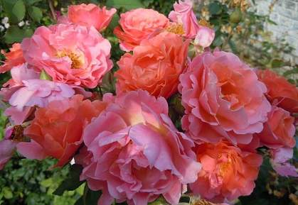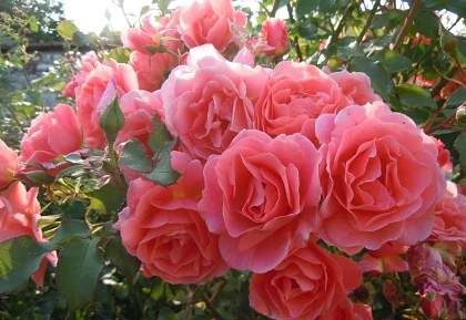 Роза плетистая Alibaba (Алибаба). Цветки очень крупные, махровые, кораллово-розовые, устойчивы к дождю. Лепестки волнистые. Насыщенный аромат абрикоса и маракуйи.