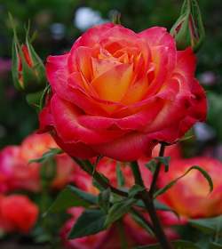 Роза Алинка давно известна розоводам. Это классический чайно-гибридный сорт с яркой окраской. Сорт неприхотливый, всегда радует, не подводит. Лепестки имеют красно-оранжевую двухцветную окраску. Цветок крупный, порой до 12 см.