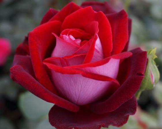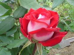 Роза чайно-гибридная Alleluia (Аллилуйя). Очень длинный бутон распускается в элегантный махровый цветок, тёмно-красный, бархатистый с серебристой оборотной стороной лепестков. Куст высотой 70-90 см с блестящей и здоровой листвой. Цветёт до заморозков.