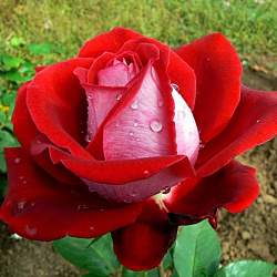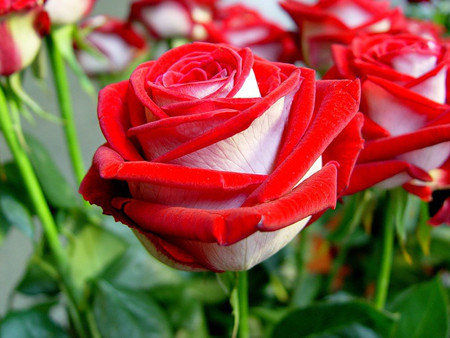 Роза Alliance (Альянс). Цветки нежные, двухцветные, необычайной раскраски, лепестки белые снаружи и красные изнутри, в основном одиночные. Размер цветка 8 см. Аромат легкий. Отлично выглядит как в жару, так и в холод.