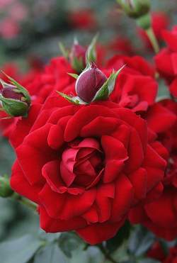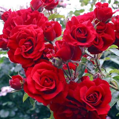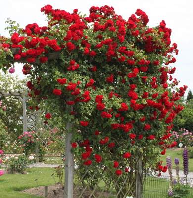 Роза плетистая Amadeus (Амадеус). Очень устойчивая к заболеваниям плетистая роза, привлекает внимание благодаря свои крупным, сияюще-красным махровым цветкам. Цвет практически не синеет, цветки появляются в кистях по 5-7 шт. Куст ветвистый, прямостоячий, густооблиственный, до 2 м высотой.