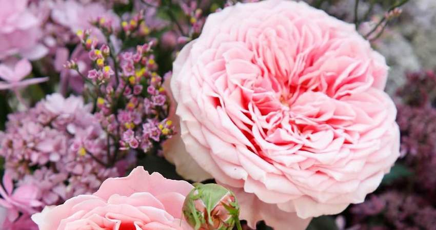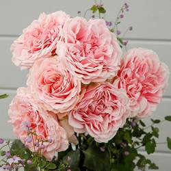 Цветки густомахровые, ностальгической формы, собраны в маленькие соцветия, диаметр цветка 8-10 см. Цветки нежной розовой окраски. Аромат средней интенсивности. Очень долго стоит в срезке. Цветение длительное, с частым повтором.