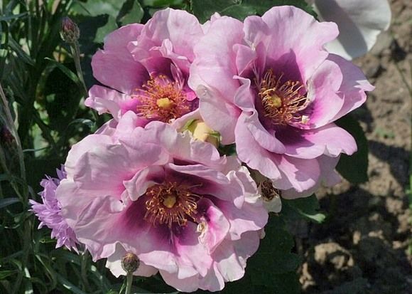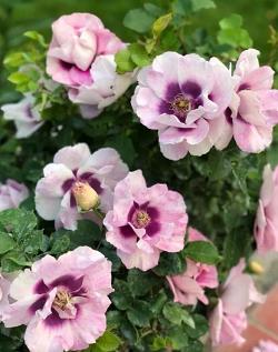 Роза Angel Eyes, Bright Eyes (Энджел Айз, Брайт Айз). Бутоны насыщенно-розовые с малиново-фиолетовыми полосами. Цветки диаметром 4-5 см, полумахровые (9-16 лепестков), бледно-розовые с интенсивным бордовым пятном в основании лепестков и жёлто-оранжевыми тычинками. Аромат лёгкий.