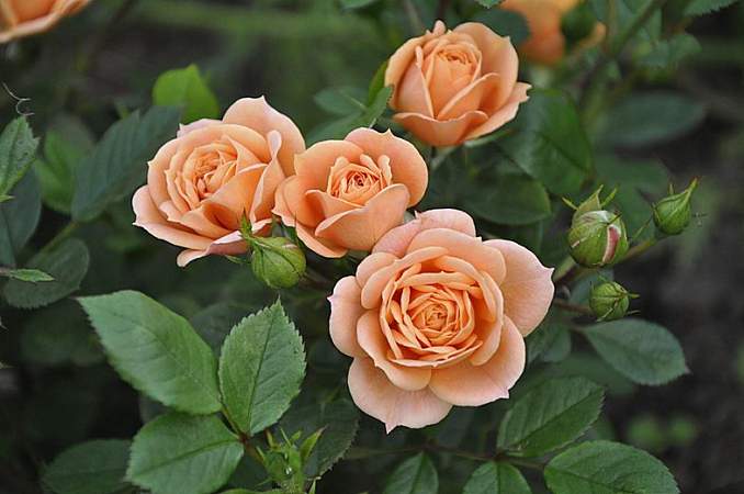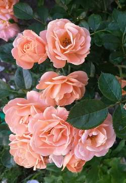 Роза Apricot Clementine (Эприкот Клементина). Эта роза отличается вновь и вновь появляющимися зонтиками цветков. Цветки диаметром 5 см, очень прочные, их оттенок красиво изменяется от розового к абрикосово-оранжевому. Кусты компактные, крепкие. Листья не восприимчивы к мучнистой росе и чёрной пятнистости. Особенно рекомендуется выращивать в горшках и балконных ящиках, а также в маленьких розариях.