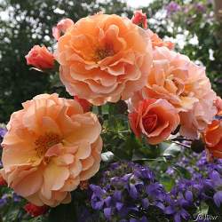 Роза Arabia (Арабия). Выдающаяся классическая роза-шраб. Чашевидные цветки диаметром 8-10 см, махровые, тёмно-оранжевые, собраны в компактные зонтиковидные соцветия. При отцветании окраска изменяется до светло-персиковой. Аромат средний пряный.