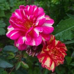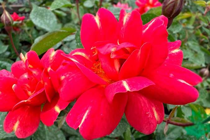 Роза Art Nouveau (Арт Нуво). Роза с уникальной окраской. Цветки красные с большими белыми мазками по центру лепестка. Очень похожи на георгины. Куст невысокий, компактный. Идеальный сорт для выращивания в контейнере. Также хороша и на клумбах. Цветет постоянно до морозов, при том, что зацветает весной одной из первых. Очень выносливая, устойчивая к болезням глянцевая листва. Зимует на отлично. Кустик пышный, аккуратный.