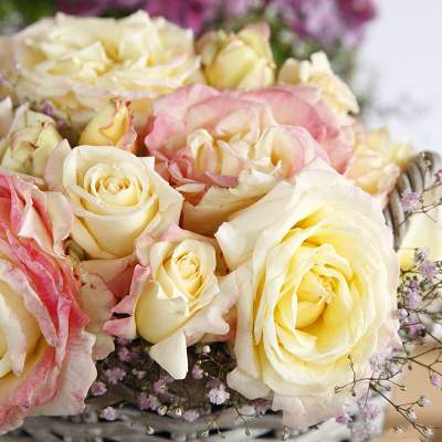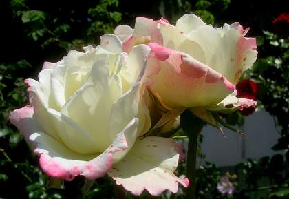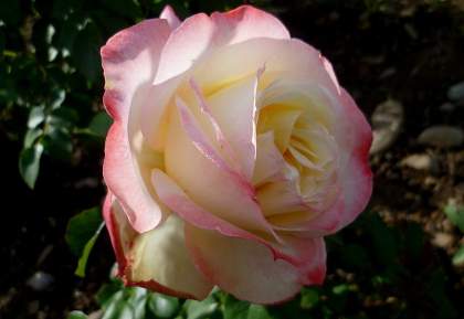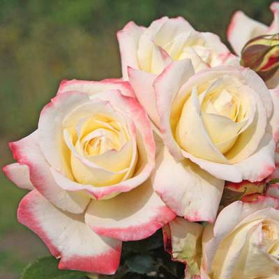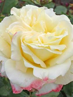 Роза Athena (Афина). Роза из серии "Eleganza", в которую входят чайно-гибридные розы нового поколения, сочетающие элегантность цветка с хорошей устойчивостью к заболеваниям. Цветки классической формы, диаметром 10-12 см, махровые, кремовые с розовой каймой, ароматные.