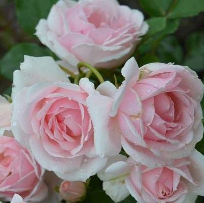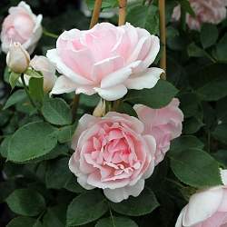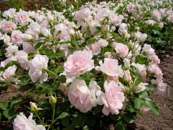 Роза Ballade (Баллада). Цветки светло-розовые, чашевидные, диаметром 8-10 см. Куст компактный и хорошо ветвящийся, с гибкими поникающими побегами. Цветет очень обильно, в розарии смотрится восхитительно — романтично и нежно.