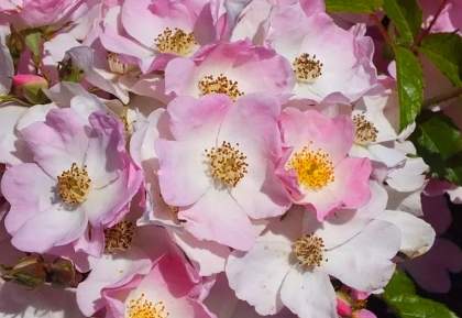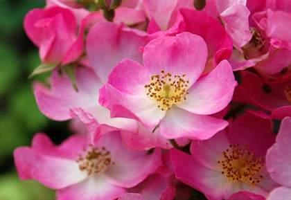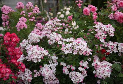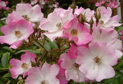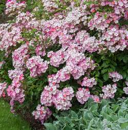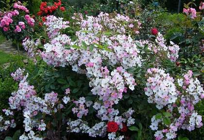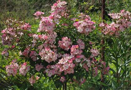 Роза мускусная Ballerina (Балерина). Обаятельнейший шраб высотой до 150 см. В цвету похож на большое розовое облако. Цветки в зависимости от возраста окрашены ярче или бледнее, а в целом картина такая, словно все переливается как перламутр. Роза цветет несколько раз за сезон и совсем без цветков не бывает. Но во время основных волн листьев практически не видно.