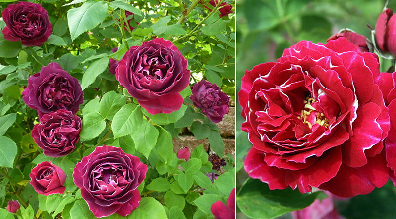 Роза Baron Girod de L'Ain (Барон Жиро дэ Лен). Окраска махровых чашевидных цветков довольно сильно варьирует в зависимости от погоды, иногда цветки темно-красные, иногда темно-малиновые или вишневые.