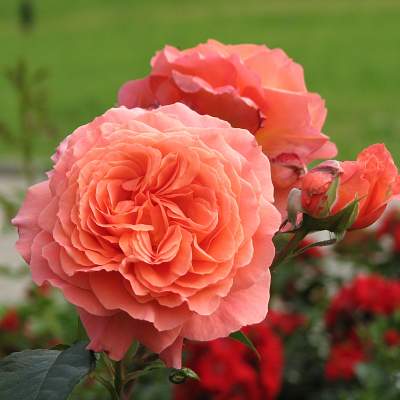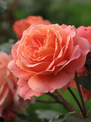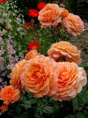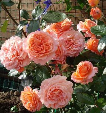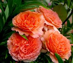 Роза шраб Belvedere (Бельведер). Цветки оранжево-персиковые, очень крупные, густомахровые, красивой формы, долго держатся на кусте и великолепно сочетаются с темно-зеленой листвой. Не выгорают.