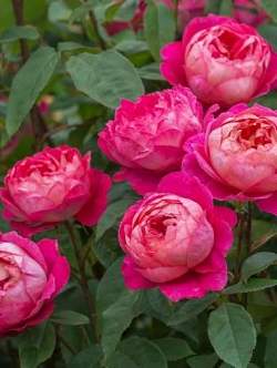Роза шраб Benjamin Britten (Бенджамин Бриттен). Куст средних размеров, высотой до 100 см и шириной до 80 см, с энергичным ростом, пряморастущий, плотный, хорошо облиственный. Листва тёмно-зелёная, полуглянцевая, средних размеров. Цветки расположены в соцветиях. Глубоко чашевидные вначале они со временем принимают форму розетки. Достаточно плотные с большим количеством внутренних лепестков.