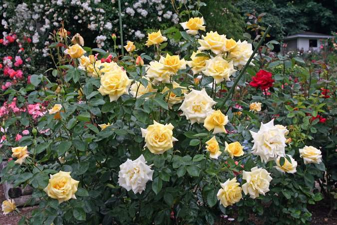 Длинные сильные стебли хороши для срезки. Листва темная, блестящая, устойчивая к заболеваниям. Куст очень высокий, в жарком климате вырастает до 2,5 м.