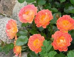 Роза почвопокровная Bessy (Бесси). Полумахровые цветки от золотисто оранжевого до абрикосового цвета. Игра цвета необыкновенная, цветки разного возраста от красно-оранжевых до золотисто-палевых. Соцветия образуют бутоны шаровидной формы. Куст раскидистый, разветвленный. Листья темно-зеленые, глянцевые.
