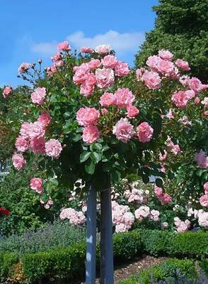 Роза самостоятельно формирует невысокий округлый куст, поэтому идеально подходит для выращивания в штамбовой форме. Наличие аромата и изысканная красота цветков также являются большими плюсами, ведь цветки будут подняты до уровня глаз.