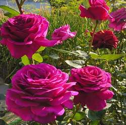 Цветки появляются обычно по одному на очень длинных побегах, и великолепны для аранжировок: их замечательный темный цвет очень ценится. Сильный розовый аромат. Листва темно-зеленая, устойчивая к болезням, куст сильнорослый, прямостоячий.