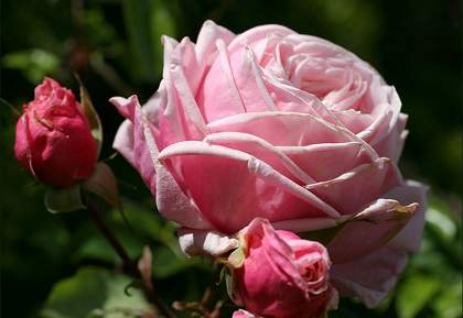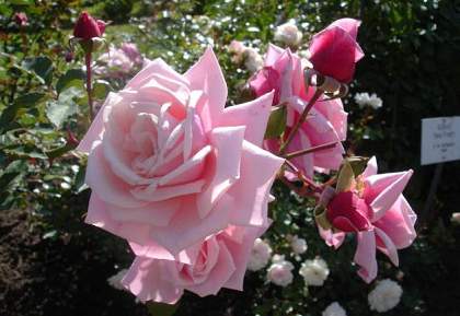 Роза плетистая Blossomtime (Блоссомтайм). Цветки раскрываются из элегантных удлиненных бутонов. Лепестки серебристо-розовые, с более темным реверсом, благодаря чему у цветка появляются темно-розовые тени между лепестками. Цветки появляются в кистях по 3-7 шт.