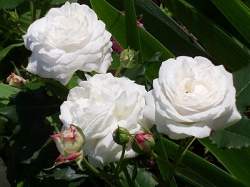 Роза Boule de Neige (Буль дэ Неж). Яркий контраст чисто белых цветков и темно-зеленых листьев освежает в самый жаркий день. Эта красивая бурбонская роза цветет молочно-белыми цветками 7-8 см в диаметре с более чем 100 лепестками. По мере того, как идеально симметричные цветки распускаются, внешние лепестки отгибаются вниз, придавая каждому цветку округлую форму и открывая зеленую пуговку в центре.