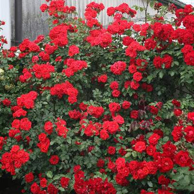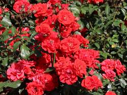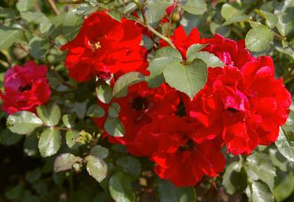 Роза Brillant Korsar (Бриллиант Корсар). Цветки ярко-оранжевые, вплоть до омарово-красных, крупные, диаметром 7 см, махровые, со свободно расположенными лепестками, в форме чаши, долго сохраняющиеся, в соцветиях. Аромат очень лёгкий, как у дикой розы. Куст высотой до 150 см и шириной 100 см. Цветёт обильно, повторно, прекрасное осеннее цветение.