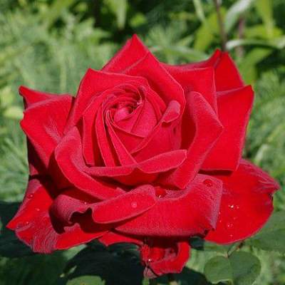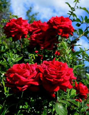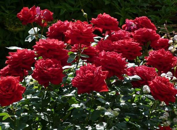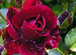 Роза чайно-гибридная Burgund (Бургунд). Бутоны почти чёрные, на длинных сильных побегах. Они имеют элегантную коническую форму, по мере распускания внешние лепестки загибаются по краям. Цветки тёмно-красно-малиновые, контрастируют с ярко-красными внутренними лепестками. Листва тёмно-зелёная, блестящая, устойчивая к заболеваниям, куст ветвистый, прямостоячий. Повторное цветение.