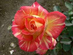 Цветки этого сорта напоминают розу Piccadilly, жёлтую с изнанки лепестков и оранжево-красную сверху, за исключением того, что оранжево-красная поверхность здесь покрыта полосками. Это сорт для любителей необычных роз. Роза обильно цветет, обладает легким ароматом. Вырастает чуть ниже средних размером, куст ветвистый, листва привлекательная, тёмно-зелёная. Аромат слабый. Размер цветка 8-10 см. Высота растения 90-100 см. Повторное цветение.