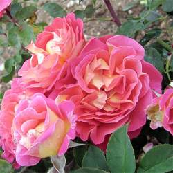 Роскошная роза с огромными цветками потрясающей окраски. Цветки чашевидные, густомахровые (40-50 лепестков), тёмно-розовые, на оборотной стороне жёлтые, в соцветиях по 3-5 штук. Лепестки волнистые. Аромат лёгкий. Цветение повторное, до заморозков.