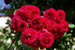 Роза Chevy Chase (Чеви Чейз). Chevy Chase — необычная плетистая роза. Густомахровые цветки Chevy Chase гораздо более аккуратные и темнее, чем у большинства рамблеров. Они также долго держат окраску, прежде чем становятся вишнево-красными. Каждый цветок представляет собой плоскую розетку идеальной формы. Цветки появляются в огромном количестве, в кистях по 10-20 шт., они одновременно очень темные и при этом яркие, светящиеся.
