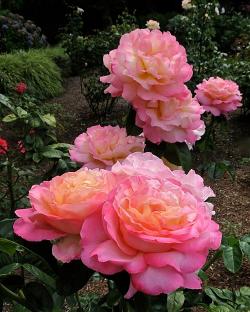 Роза чайно-гибридная Chicago Peace (Чикаго Пис). Открытый в США, в Чикаго, этот спорт всемирно известной Peace (Глория Деи) во всем идентичен ей, за исключением гораздо более яркой окраски — смеси карминового, кораллово-розового и золотого. Существует много спортов от Peace, но этот, пожалуй, лучший!