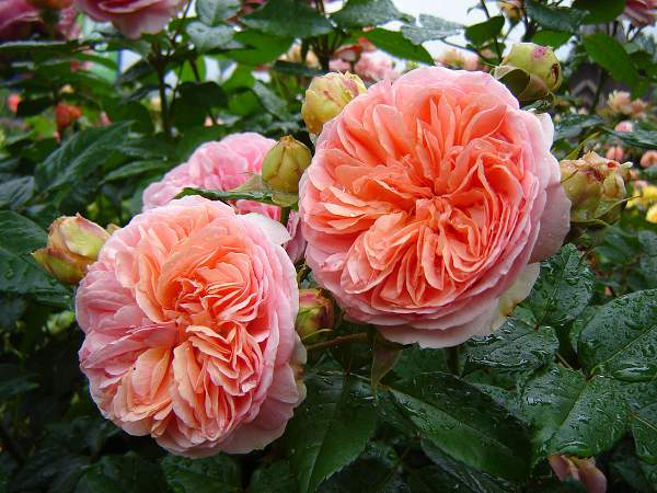 Роза Chippendale (Чиппендейл). Сильнорослый шраб с темной блестящей листвой. Цветки насыщенно-розовато-оранжевые, очень душистые, густомахровые в старинном стиле. Очень обильное повторное цветение. Цветки очень хорошо стоят в срезке. Подходит для посадки в массивах на клумбах на заднем плане.