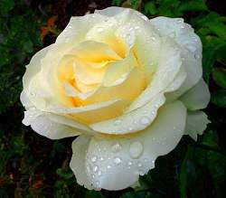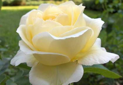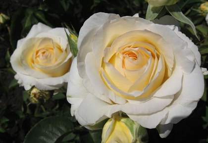 Роза чайно-гибридная Chopin (Шопен). Роза поразительно быстро набирает рост, обильно и продолжительно цветёт: в первый же год дала побеги 150-170 см, на каждом из которых было по 3-5 цветков диаметром 14-15 см. В общем, роза-гигант. При этом куст не разваливается, сохраняя красивую форму. Цветы бело-кремовые, в центре с густым оттенком кипячёных сливок. Листья очень крупные, красивые.