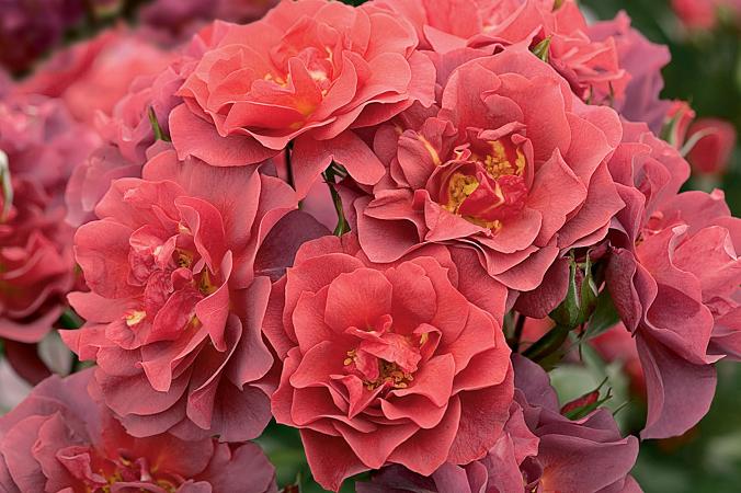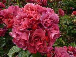 Флорибунда с очень необычным цветом ржавого красного апельсина с пепельным лавандовым оттенком при отцветании. В прохладную погоду дымчатая окраска усиливается.