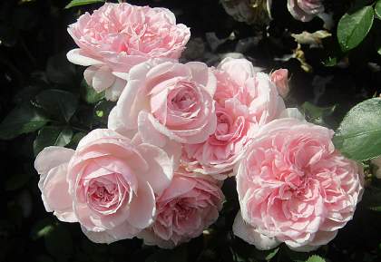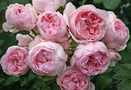 Роза флорибунда Cinderella (Синдерелла). Цветок нежно-розового цвета в стиле старинных роз. Цветки крупные, шаровидной формы, в кистях по 4-6 шт., сильно пахнут зелеными яблоками.