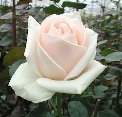 Заостренный, плотный, слегка кремового цвета бутон, светлеющий при роспуске. Цветы почти белые, крупные, густомахровые. Куст высокорослый, лист ярко-зелёный, глянцевый. Аромат слабый. Размер цветка 12 см. Высота растения до 110 см. Повторное цветение.