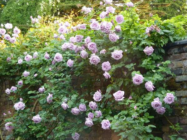 Роза Climbing Si-Si (Клайминг Си-Си). Выдающаяся плетистая роза с крупными сиреневыми цветками. На солнце они более сиреневые, чем в тени. В тени кажутся розовыми. Аромат очень сильный, розовый. Листва зеленая, глянцевая. Куст сильнорослый, мощный, высотой до 400 см.