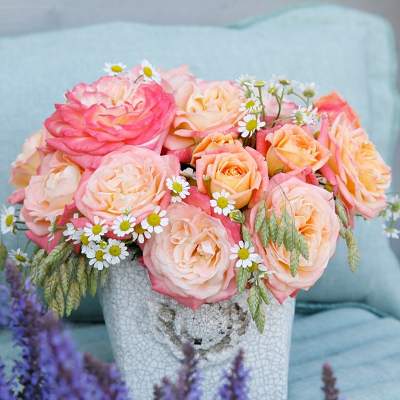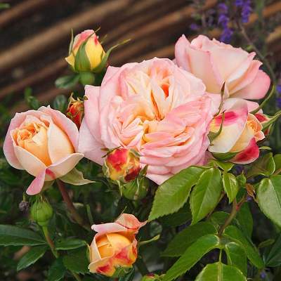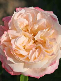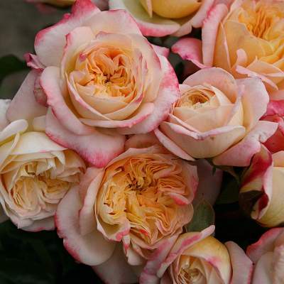 Роза Concorde (Конкорде). Цветки диаметром 8-10 см, густомахровые, шаровидные, ностальгической формы, как у старинных роз. Распустившиеся цветки кремово-жёлтые, затем у них появляется красноватый край, который тем интенсивнее, чем сильнее светит солнце. Аромат лёгкий. Цветение повторное.