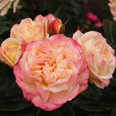 Роза Concorde (Конкорде). Цветки диаметром 8-10 см, густомахровые, шаровидные, ностальгической формы, как у старинных роз. Распустившиеся цветки кремово-жёлтые, затем у них появляется красноватый край, который тем интенсивнее, чем сильнее светит солнце. Аромат лёгкий. Цветение повторное.